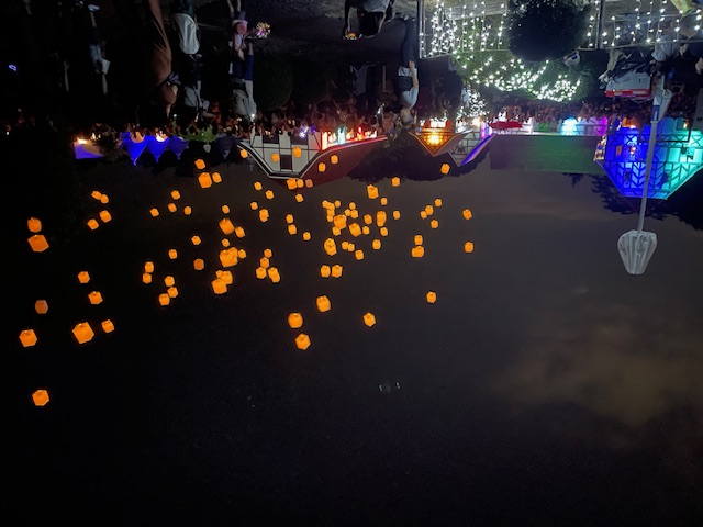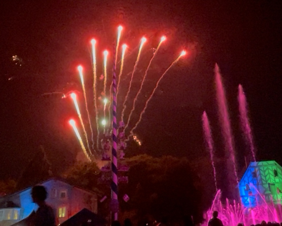 食べ終わる頃に音楽が始まり、噴水のイルミネーションからイベントが始まります。そしてスカイランタンからの花火。