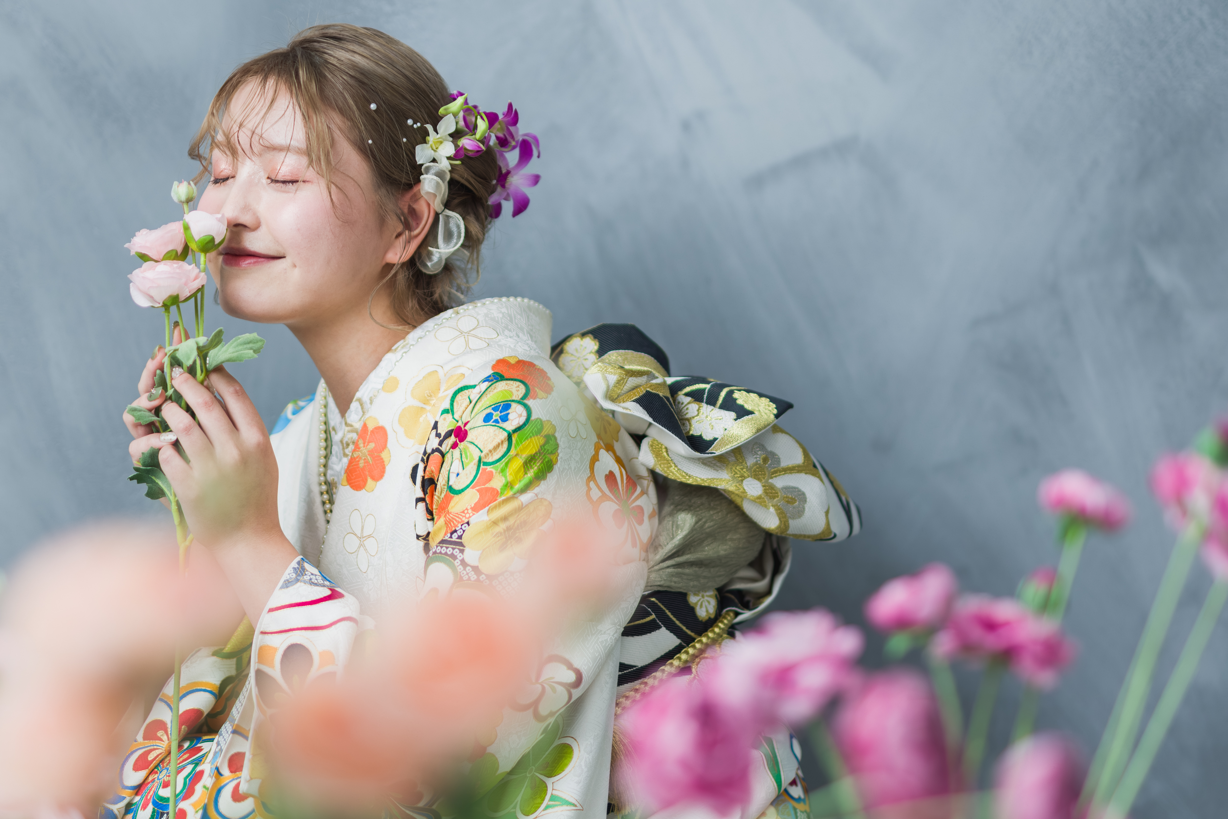 大人っぽいグレー背景には、華やかなお花でとびっきりかわいく♡