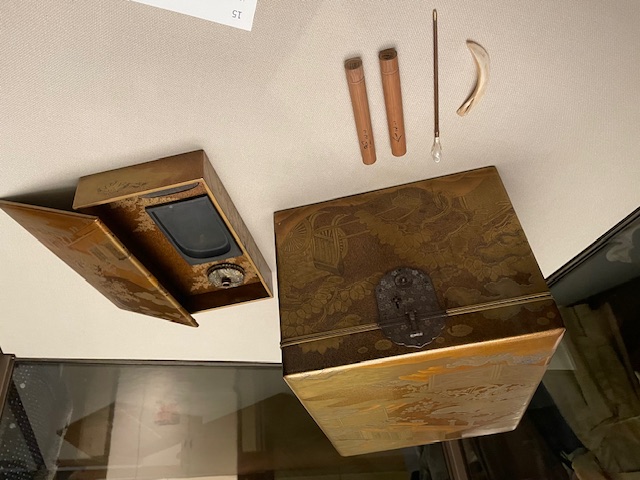 さらに奥には、今回の特別展が『源氏物語絵巻』なので、その関連として展示されたのでしょうか・源氏物語を題材とした屏風や色紙、硯箱なども展示されていました。源氏物語ファンで身の回りの物を何でも源氏物語関連のものでいっぱいにしたい!と思う人が、沢山いらしたのでしょうね
