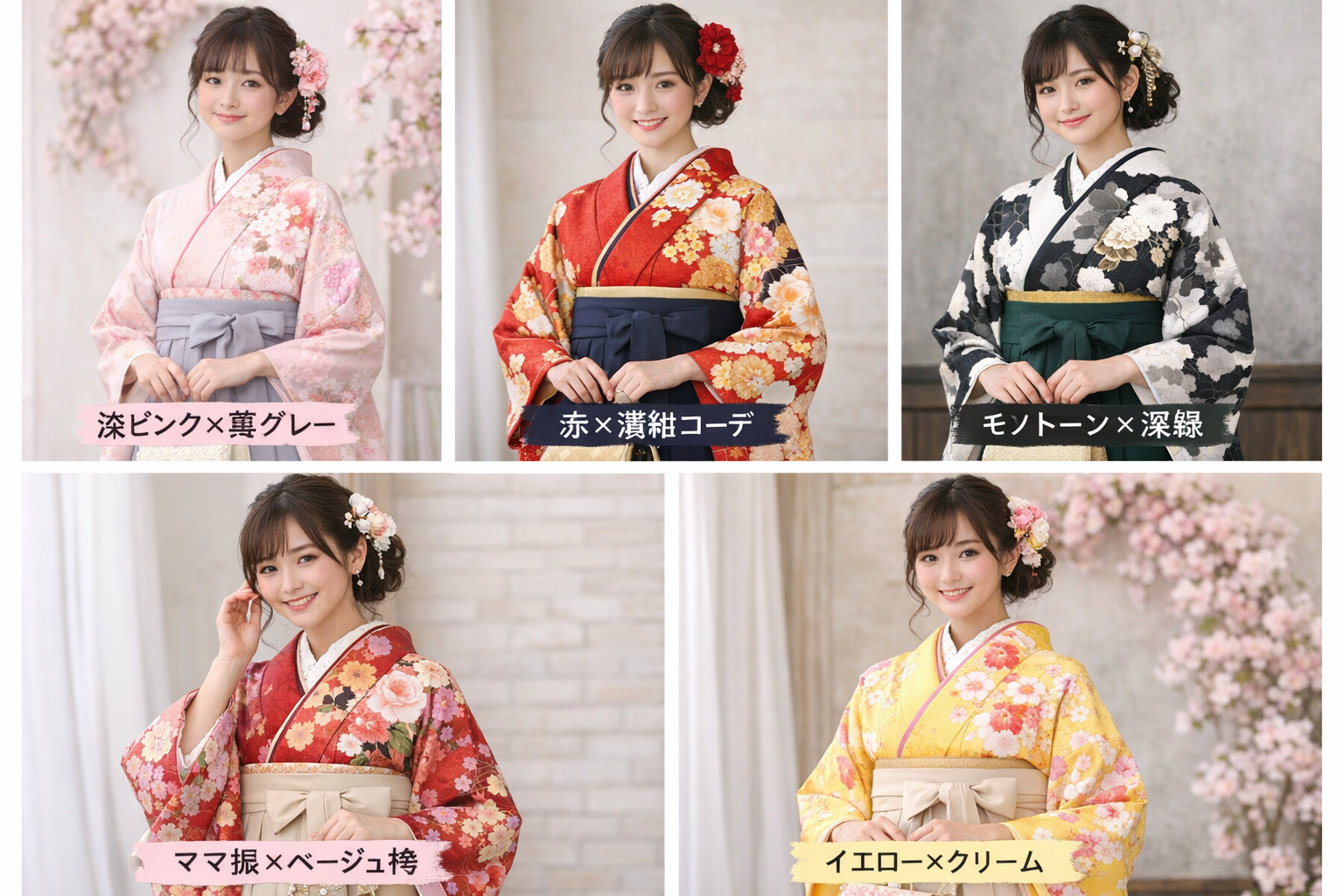 春の卒業式は、振袖×袴の色合わせと小物で自分らしく華やかに演出できます。